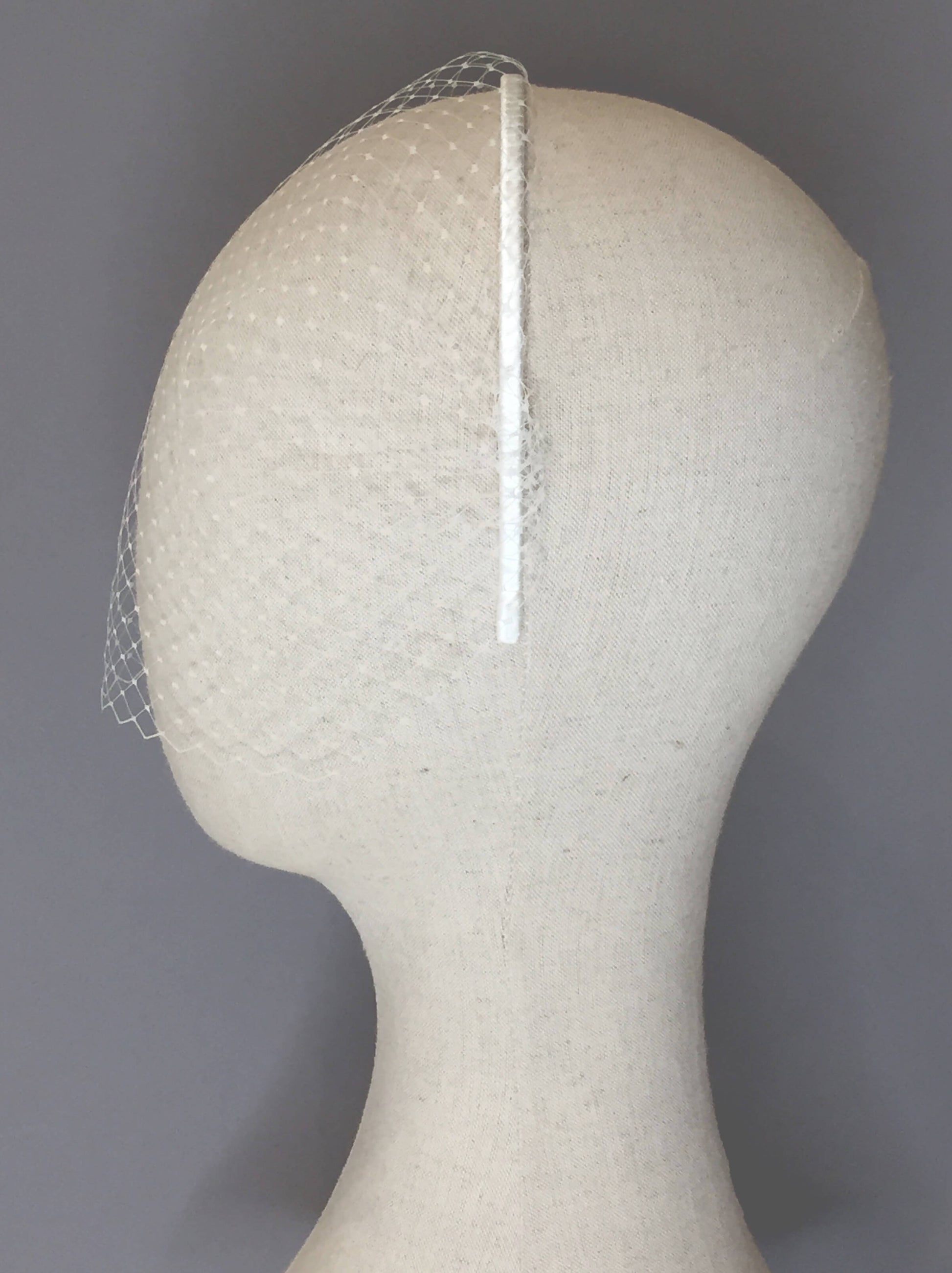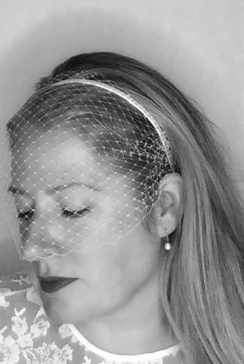 Handmade in London, this veil is made from a high-quality metal headband which is then hand-wrapped in luxurious pure silk double satin ribbon that has a soft gentle sheen. The soft, delicate veiling is handsewn to the headband for a secure and impeccible finish.