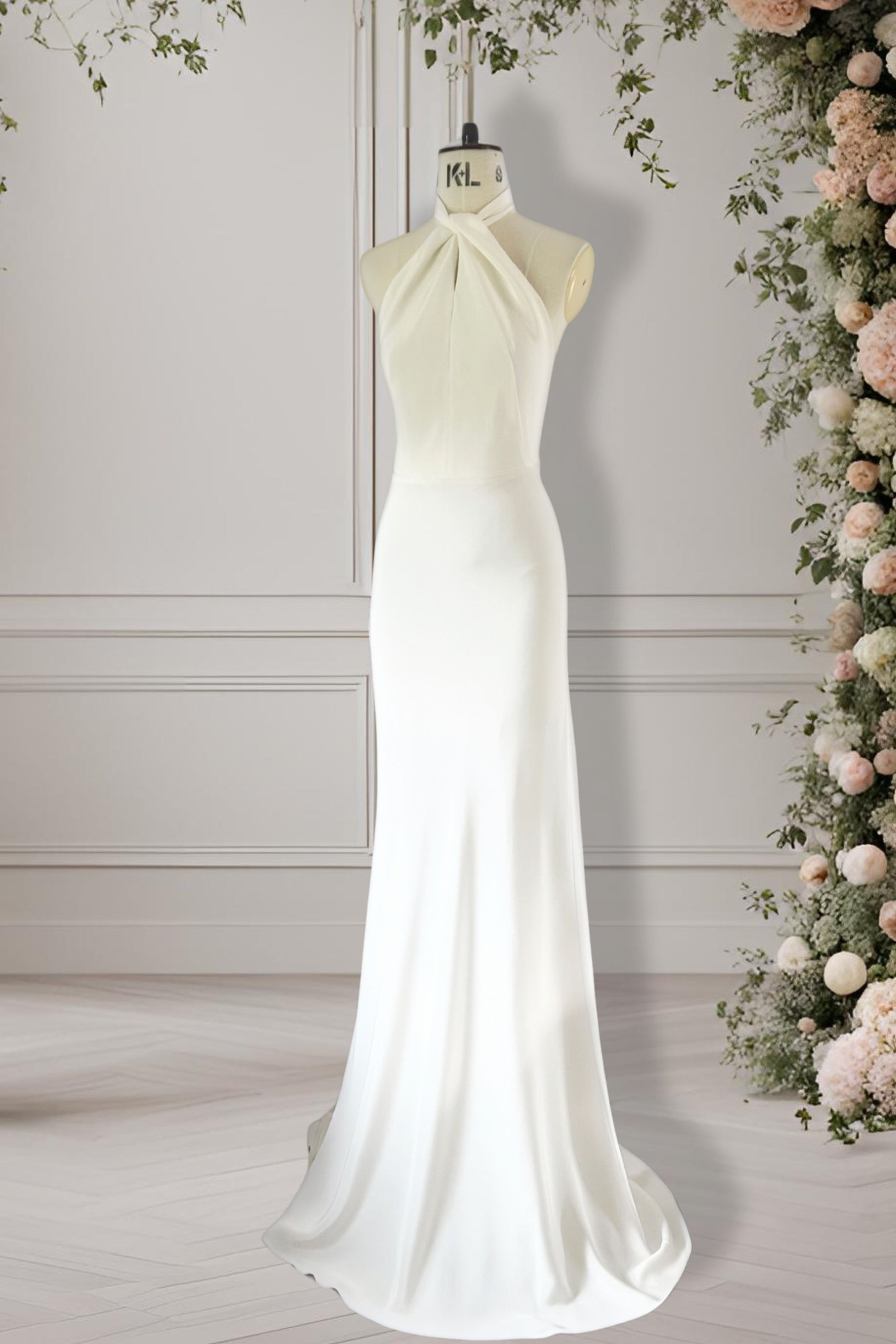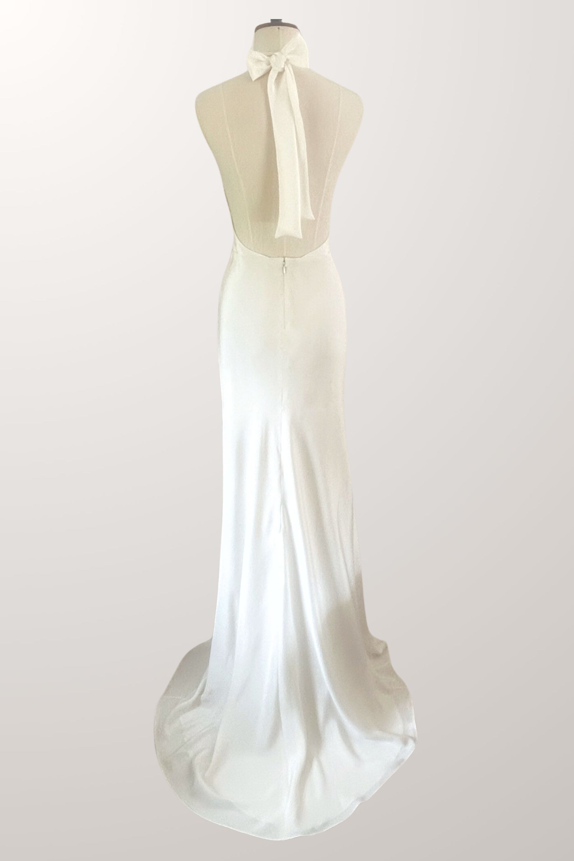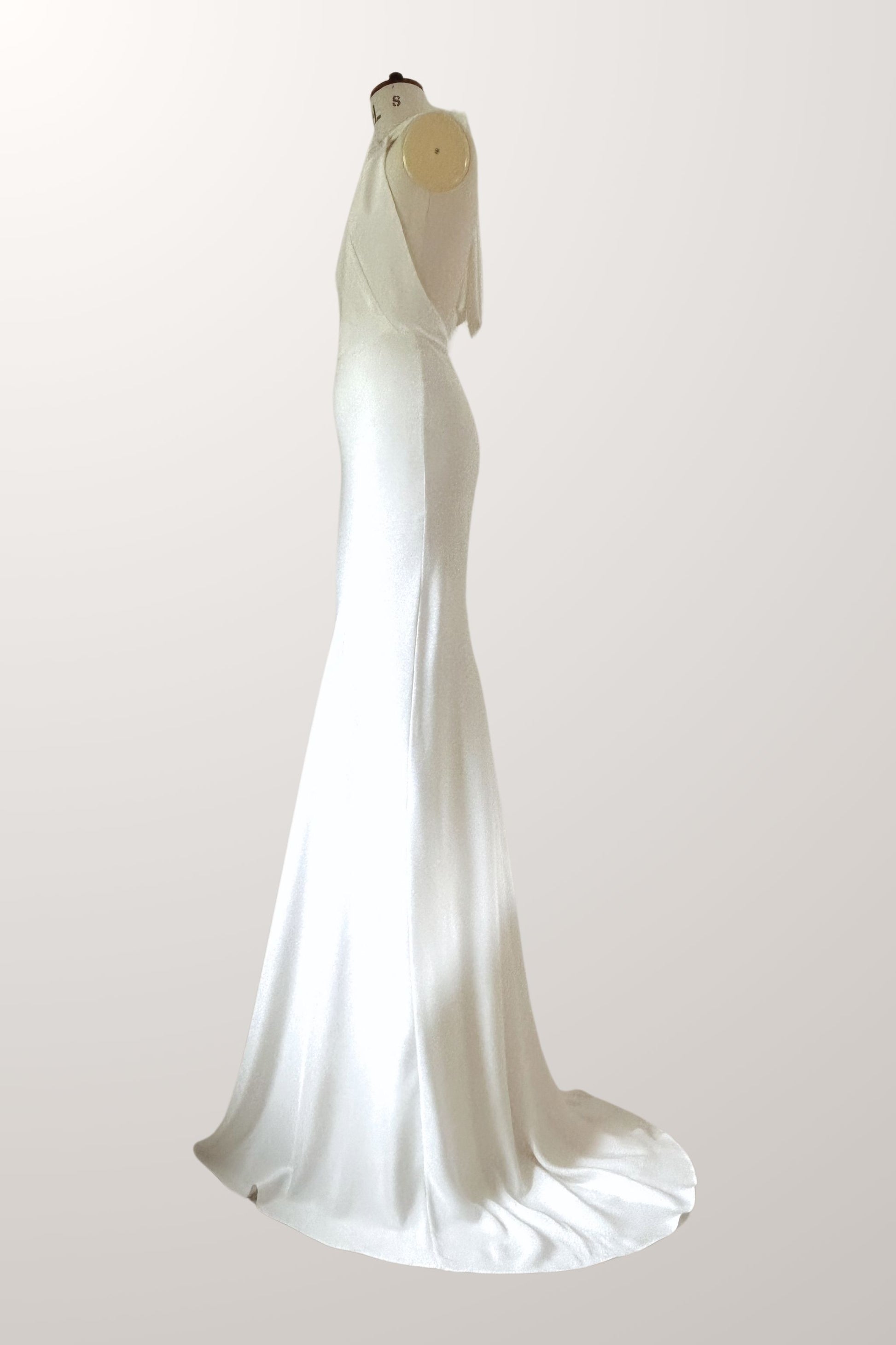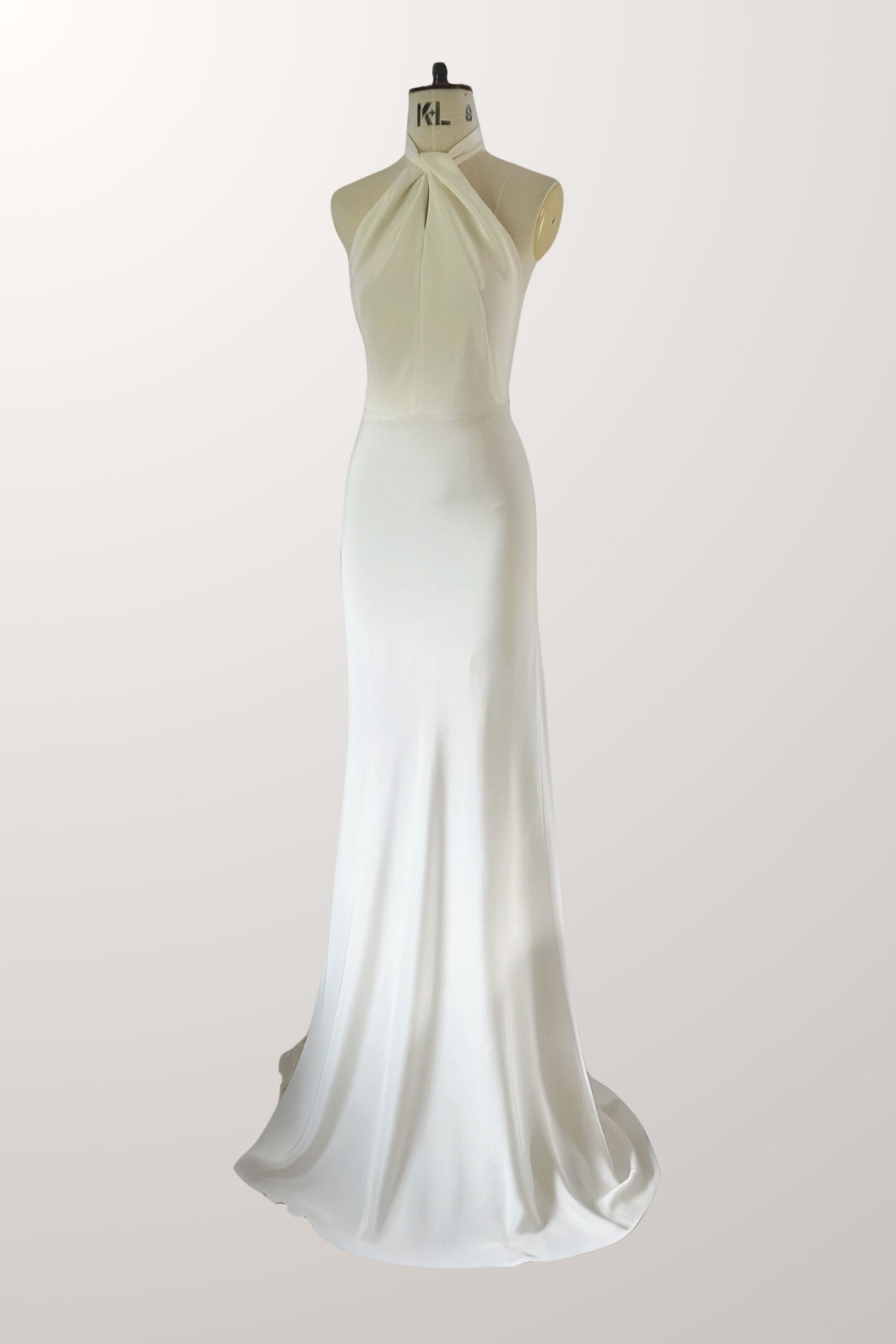 Monaco, where elegance meets glamour. The Monaco halter neck bridal gown is made in sumptuous silk with a long bias-cut skirt that hugs every curve. It’s designed with a high draped front neck and a low open back that shows off your back and shoulders. A stunning gown for when you know less is more.